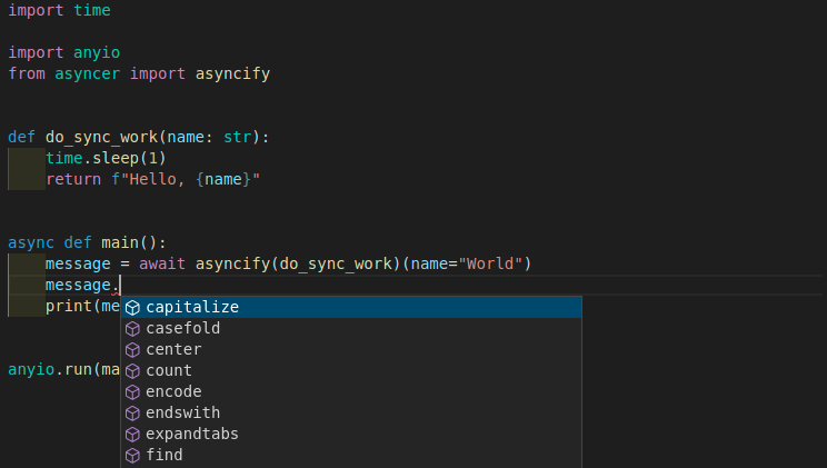 And of course, because the way Asyncer is designed, you will get typing support with inline errors and autocompletion for the function arguments: