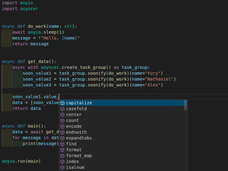 Because of the way Asyncer is designed, you will get typing support in these SoonValue